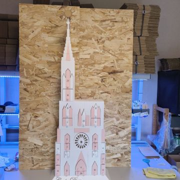 La bijouterie souhaitait un calendrier de l’Avent sur mesure, composé de 24 cases, reprenant la forme de leur logo, inspiré de la cathédrale de Strasbourg. La case 24 devait être positionnée sur la Rosace, élément central du design. Le calendrier devait respecter les couleurs de la boutique et être produit en deux exemplaires identiques pour leurs deux points de vente.